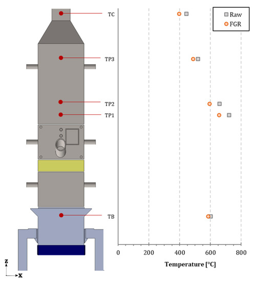 Gas temperature profile along the combustion unit for experiments with and without flue gas recirculation (FGR and Raw, respectively). Temperatures were measured in the pellets (TB), in the post-combustion chamber (TP1, TP2, TP3) and in the chimney (TC).