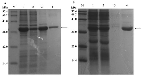 SDS-PAGE analysis of the recombinant fluorinase expressed in different hosts ((A), BL21; (B), Rosetta). Lane M, protein molecular mass marker; Lane 1, whole-cell proteins; Lane 2, soluble region; Lane 3, insoluble region; Lane 4: purified recombinant flA.