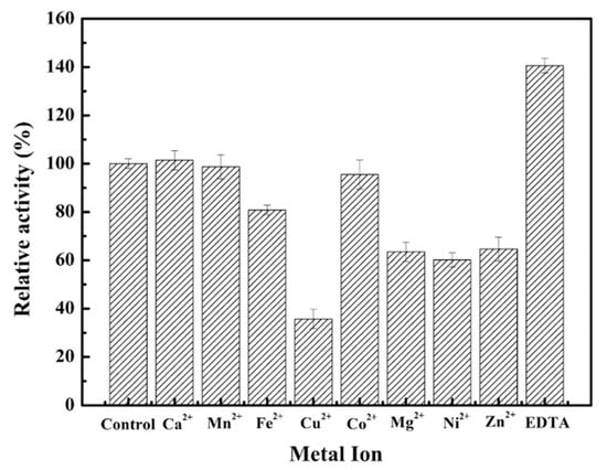 Prior to preparing the fluorinase@fluoridated hydroxyapatite nanoflowers (FDAS@FHAp-NFs), we examined the effect of metal ions on fluorinase. Fluorinase was used without any metal ions and EDTA as the control group, and its catalytic synthetic activity was set as 100%. As shown in Figure 2, 1.0 mM Ca2+, Mn2+, and Co2+ exerts no influence on the activity of FDAS.