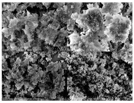 SEM photographs of hydroxyapatite (HAp, (A)), fluorinase@hydroxyapatite nanoflowers (FDAS@HAp NFs, (B)), fluoridated hydroxyapatite (FHAp, (C)), and fluorinase@fluoridated hydroxyapatite nanoflowers (FDAS@FHAp-NFs, (D)).
