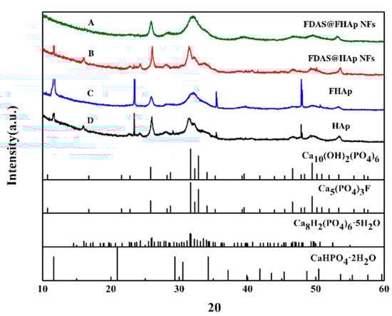 XRD of fluorinase@fluoridated hydroxyapatite nanoflowers (FDAS@FHAP NFs, (A)), fluorinase@hydroxyapatite nanoflowers (FDAS@HAp NFs, (B)), fluoridated hydroxyapatite (FHAp, (C)), and hydroxyapatite (HAp, (D)).