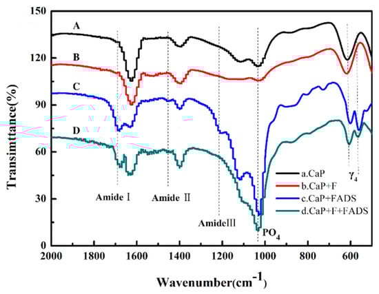 FT-IR was also used to characterize the obtained fluorinase@fluoridated hydroxyapatite nanoflowers, and the result in the upper panel in Figure 5 indicates that the remineralized complex, which was prepared using fluorinase, presents protein and phosphate minerals. The main absorption peak of the protein is the amide band, including band I, band II, and band III. Amide band I (1690–1630 cm−1) is mainly due to the strong absorption of γC = O. Comparing this with that of the free enzyme, a red shift occurs to the amide of the immobilized enzyme. It is speculated that the enzyme may adhere to the inorganic support hNFs, which have some influence on the spatial structure of the enzyme. The amide band II (1420–1400 cm−1) is the absorption band of the strong carbon–nitrogen bond stretching vibration, and the absorption band of the amide bond of the enzyme on the support shifted a little, which indicates that no change of the main structure occurs in the enzyme protein after the immobilization by biomineralization and the formation of h-NFs. In addition, the (PO4)3− belt and the γ4 belt are absorption bands for the (PO4)3− stretching vibration. At the same time, the γ4 band (600 cm−1 and 558 cm−1) demonstrates the interaction of calcium phosphate with the fluorinase protein after biomimetic mineralization [31]. Comparisons of the FT-IR spectra of samples A, B, C, and D show that the shift of the bands will also be offset after the introduction of F. This shift may be the overlap of fluoridated hydroxyapatite and octacalcium phosphate (OCP), when the hydroxyapatite layer is grown on the OCP precursor [45].
