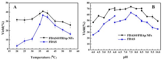 Optimum temperature (A) and pH (B) profiles for the synthetic activity of FDAS@FHAp NFs and FDAS. Three different buffers, citric sodium citrate buffer (pH 4–6), phosphate buffer (pH 6–8.5), and glycine/sodium hydroxide buffer (pH 8.5–10) were used.