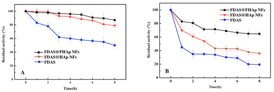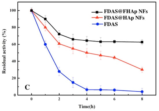 The enhanced thermal stability of the FDAS-FHAp-NFs may be due to the substitution of F− for OH− on the support, which results in a reduction of the unit cell volume and a denser lattice. Subsequently, the electrostatic attraction between fluoride and adjacent ions would strengthen, and the thermal stability of the FDAS-FHAp-NFs would be greatly improved. Fluoride has been shown to be able to replace the columnar hydroxyl groups, which are distributed in the apatite structure [32]. This reduces the volume of the formed crystals and, therefore, increases the rigidity of the confined enzyme and consequently, enhances the thermal stability of the enzyme preparation.