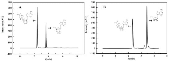 Comparison of HPLC analysis of the synthesized 5′-fluorodeoxy adenosine using FDAS enzyme preparations ((A) free FDAS catalysis and (B) enzyme@FHAp-NFs of FDAS catalysis).