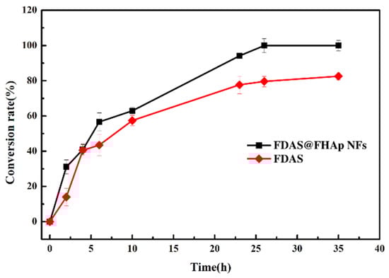 As shown in Figure 9, more than 98% of S-adenosyl-L-methionine (SAM) substrate was transformed to product 5′-fluorodeoxy adenosine using FDAS@FHAp-NFs after 25 h of reaction. In addition, the FDAS@FHAp-NFs gave a better catalytic activity than that of the same amount of free FDAS in the synthesis of 5′-fluorodeoxy adenosine (5′-FDA) when S-adenosyl-L-methionine (SAM) and a fluoride ion were used as substrates. By comparison, it can be concluded that in the first two hours, the conversion rate of the immobilized enzyme was twice that of the free enzyme. With the extension of the reaction time, the product conversion rate gradually increases, but the free enzyme is still lower than the immobilized enzyme. This may result from the more remarkable loss in enzyme activity for the free enzyme than for the FDAS@FHAp-NFs as the reaction time increases.