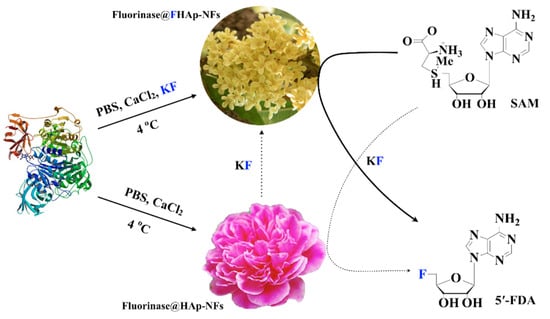 In this work, to investigate the effect of fluorine (F) on the co-crystallization and biomineralization of fluorinase (5′-fluoro-5′-deoxy adenosine synthetase (FDAS)) and reusable calcium phosphate [34] to achieve the sustainable circular bioeconomy [35], the formation of nanocrystals of fluoride-substituted hydroxyapatite was mediated by fluoride and recombinant fluorinase to obtain fluorinase@fluoridated hydroxyapatite nanoflowers. The nanoflower was used in the biosynthesis of 5′-fluorodeoxy adenosine (Scheme 1), and the effects of reaction conditions on the yield were examined. Under the optimal crystallization conditions, flower-shaped hybrid catalyst containing F ions, different from fluorinase@hNFs are formed, not only presents the enhanced thermal stability, but also gives the conversion rate of the substrate of 98%.