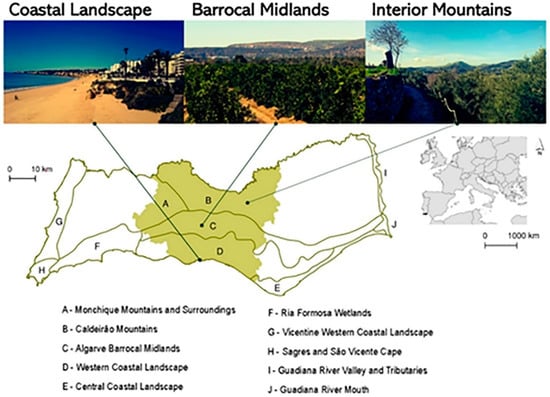 The study area corresponds to the municipalities of Silves, Albufeira, and Loulé (green area of Figure 1), Algarve region, southern Portugal, marked by its Mediterranean climate and permeated by three fundamental landscape units: Interior Mountains (A), Barrocal Midlands (B), and Coastal Landscape (C) [29].