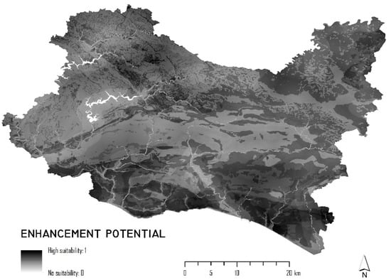 Suitability map of enhancement potential for the creation of new pedestrian paths of Silves, Albufeira, and Loulé municipalities, Algarve region, southern Portugal.