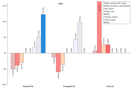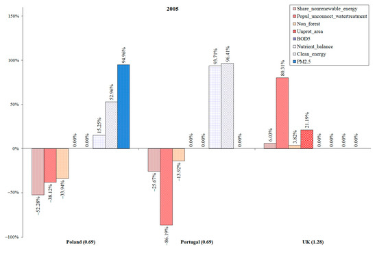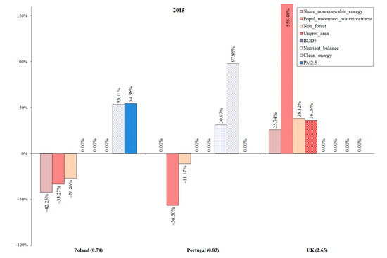 Such an analysis of the sources of super-efficiency and inefficiency provides detailed guidance on how to improve the efficiency of implementing the sustainable development policy and thus enables a faster way to achieve efficiency by inefficient objects. Because such analyses are generally quite similar for each DMU, a sample analysis for selected countries will be presented below. Each country belongs to a different geographical group and has different characteristics and efficiency scores. The analysis of the sources of super-efficiency and inefficiency is illustrated in detail for three selected countries: Poland, Portugal (inefficient countries) and the United Kingdom (a super-efficient country). The results of the entire analysis of the sources of super-efficiency and inefficiency are included in the Appendix B.