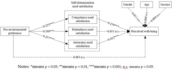 This study uses a conceptual research model to explore the mediating role of need satisfaction for competence, relatedness, and autonomy in the relationship between pro-environmental preference (PEP) and consumers’ perceived well-being (PWB). The data were collected on WJX (a Chinese online recruitment platform) from a sample of 514 respondents and analyzed using Smart PLS 3. The results indicated that two need satisfactions (competence and autonomy) fully mediate the relationship between PEP and consumers’ PWB. However, surprisingly, relatedness need satisfaction has no mediation effect in the relationship between PEP and consumers’ PWB. The results demonstrate the pivotal role of self-determination theory in explaining the primary psychological needs that must be met for consumers to perceive heightened states of well-being. Moreover, the results can signify to policymakers how to translate the impact of PEP into consumers’ PWB.