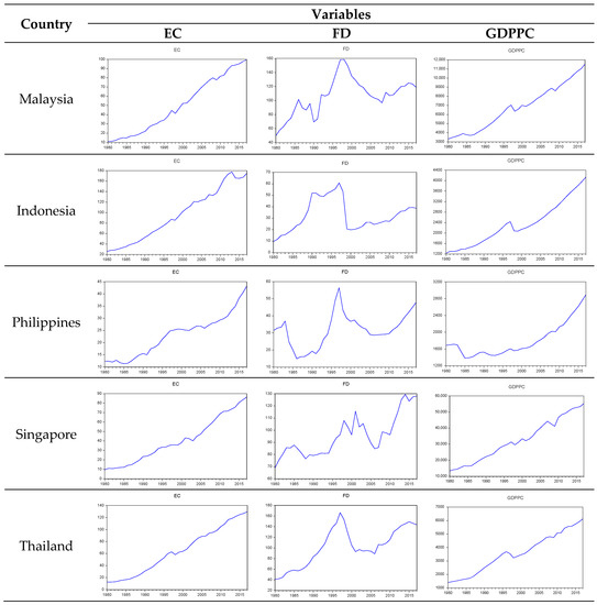 This paper investigates the long-term relationship between energy consumption, financial development and economic growth in ASEAN-5, namely, Malaysia, Indonesia, the Philippines, Singapore and Thailand. For empirical analysis purposes, the study employs annual data obtained from the World Development Indicators (WDI) of the World Bank from 1980 to 2017. We use primary energy consumption (Million Tons of Oil Equivalent) as a proxy for each country’s energy consumption [52]. This is reported in net terms and adjusted for nuclear and hydroelectric generated energy values as well as renewable energy. To measure the financial development, we use the country’s domestic credit to the Private Sector (percentage of Gross Domestic Product) as this is a broad measure of financial sector development [9]. Further, GDP per capita (in current US dollars) is used to measure the economic growth of the countries [53]. All of these proxies have widely been used in previous studies [5,9,20].