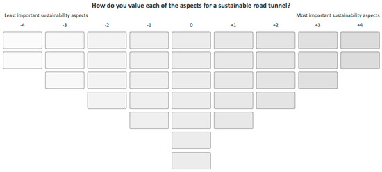 These criteria left 35 sustainability aspects in the selection, which was recognized as an unambiguous and inclusive set that would allow practitioners to construct a perception of a sustainable tunnel. From a technical standpoint, the size falls within the required limits for applying Q-methodology. McKeown et al. [45] offer some guidance on this by advocating that a list of 20 to 80 aspects would allow for a manageable and representative proportion of statements for Q-sorting.