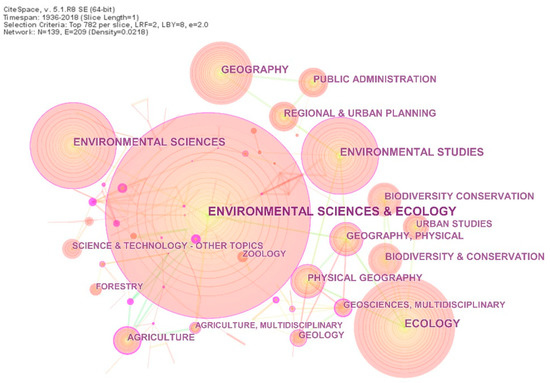 The subject distribution status of RLR can be obtained by visualizing the results through the ‘Category’ option in CiteSpace. After simplifying and merging the data with the same subject, 139 nodes and 209 lines were extracted, and betweenness-centrality analysis was performed (Figure 1). This analysis showed that RLR is involved in more than one hundred disciplines. In five of these disciplines, the number of articles published exceeded 1000, including the disciplines of environmental sciences and ecology, ecology, environmental sciences, environmental studies, and geography. The betweenness-centrality value exceeded 0.1 in 11 disciplines (e.g., engineering, social sciences and interdisciplinary, agriculture, and environmental sciences and ecology). Although there were few publications in some disciplines (e.g., psychology, social sciences and interdisciplinary), the betweenness-centrality value was relatively high, reflecting that these disciplines play a pivotal role in the construction of the interdisciplinary collaboration and research system. In addition, according to the intensity value of the connection lines, environmental sciences and ecology has a strong connection with similar fields such as environmental studies, and also has close interdisciplinary relationships with other subjects, such as geography, urban study, public administration, agriculture, and social sciences, among others.