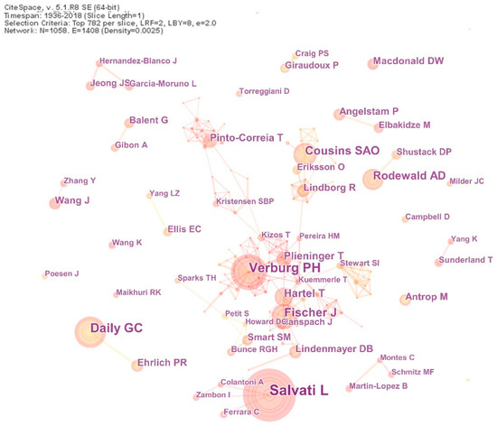In the mapping knowledge domain of author cooperation in CiteSpace, there were 1058 nodes and 1408 lines that connected the nodes. Among them, 18 authors published more than ten articles. Salvati, who published the largest number of articles, had 47 articles included in the WoS database. Moreover, there were relatively dominant academic associations. Among them were Verburg, Plieninger, Fischer, Hartel, Hanspach, and some other authors (Figure 2). Their academic backgrounds include agriculture, environmental geography, ecology, agricultural sociology, landscape ecology, etc., showing the interdisciplinary relationships.