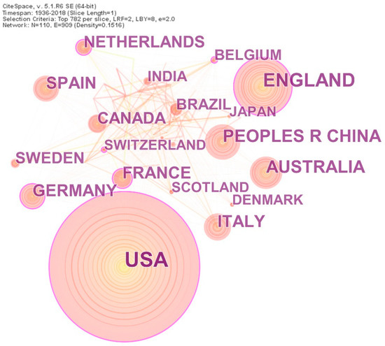 The cooperation network of countries showed 110 nodes and 909 lines connecting the nodes, among which, scholars in the United States published the largest number of articles (1958). A total of 12 countries published more than 200 articles. The betweenness centrality in France, New Zealand, Switzerland, the United States, Britain, Germany, and Belgium, was more than 0.1 (Figure 3). Most of the high volume of publications and high betweenness-centrality values were found in European countries, likely due to the similar natural and geographical environment that makes European countries form strong research links. European countries’ alliances and organizations on landscape research, as well as the formulation and promulgation of some conventions and policies, have important significance for the research and development of rural landscapes and have been widely used for reference. These include the European Landscape Convention of the Council of Europe, which promotes the protection, management, and planning of the landscapes and organizes international co-operation on landscape issues.