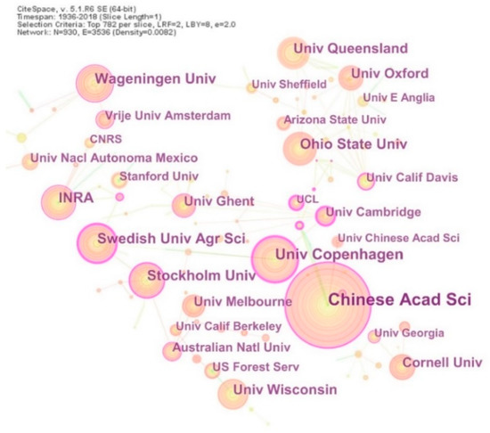 CiteSpace showed 930 nodes and 3536 lines for the organizations where research was conducted. Among these, 11 organizations published more than 60 articles in the field. Chinese Academy of Sciences had the largest number of papers published, with 138 articles in the WoS database. Three research organizations, Chinese Academy of Sciences, University of Copenhagen, and University of Cambridge, had a betweenness-centrality value over 0.1, reflecting their importance and influence in the field (Figure 4). Comparative analysis showed a direct correlation between the number of papers published by researchers at specific organizations and the number of papers published in countries where those organizations were located. For example, researchers at the University of Wisconsin, Ohio State University and Stanford University in the United States published numerous papers on RLR, which contributed to the high number of papers published in the United States.