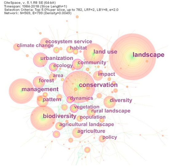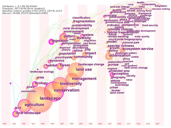 According to the results of the keywords co-occurrence analysis, by eliminating the retrieval terms, the four keywords that have been used over a long time and have high-frequency (Frequency over 700) were ‘protection’ (1034), ‘biodiversity’ (839), ‘management’ (829), and ‘land use’ (707),which can thus be considered the major fields and basic contents of RLR (Figure 5). The keyword time zone map shows these four high-frequency keywords began to appear in 1984, probably because the keywords of the early literature were not included in WoS. Of these, land use, protection, and management have a relatively high betweenness-centrality value and are media keywords for multidisciplinary and interdisciplinary studies of rural landscapes (Figure 6). In addition, the frequency of co-occurrence of key words such as urbanization, agriculture, forests, and diversity all exceeded 400. Among them, urbanization and agriculture have relatively high betweenness-centrality values. In each subject area, we selected representative articles based on the frequency of citations from high to low and more closely related to the topic and analyzed the research contents.