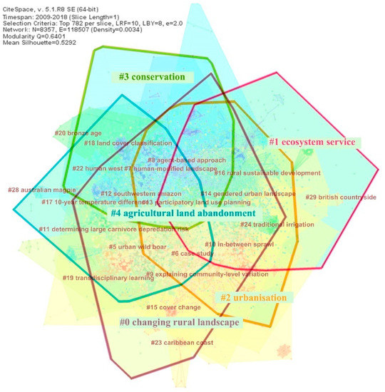 The co-citation clustering view of RLR was generated with cited references as node types, and the maximum displays in each time slice are the total number of citations. Q = 0.6401 represents the significant modularity of the clustering network. S = 0.5292 represents a relatively high homogeneity of the network and ideal results of clustering. In Figure 7, there are a total of 29 clusters. In order to maintain the clarity of clusters, only five of them with the largest number of references and the highest homogeneity were highlighted and sorted out, and then the highly related noun terms derived from these clusters were summarized (Table 1). The frequently cited references in the clusters were read intensively. Next, according to the time zone chart of keyword co-occurrence, the branches of various studies were derived from the interpretation of basic thematic research on rural landscapes in the past ten years. The cutting-edge frontiers of the rural landscape were thereby determined. We found the following five main research pathways and sorted out the core contents.