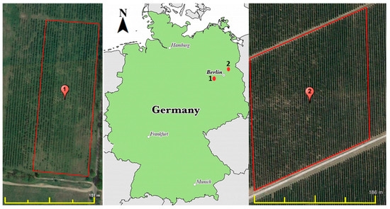 In this study, two commercial apple orchards located in a fruit production area of Germany were selected: The Glindow’s commercial apple orchard with longitude and latitude of the field center being 52°21′15.8″ N 12°51′53.8″ E (path/row: 193/23 for Landsat 8 satellite images). The cultivar of the apple (Malus × domestica Borkh.) is ‘Pinova’, which was harvested 24 September 2018 in the present orchard. The Altlandberg’s commercial apple orchard located with longitude and latitude of the field center is 52°36′27.5″ N 13°49′3.07″ E (path/row: 192/23 for Landsat 8 satellite images) with the cultivar (Malus × domestica Borkh.) being ‘Gala’, was planted in 3.5 × 1.0 m distance. The common irrigation system in this area is drip irrigation. Both sites have semi-humid climate and are geographically surrounded by fruit orchards (Figure 1).