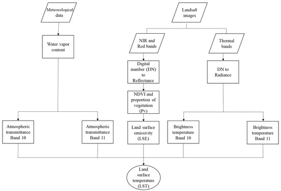 In order to retrieve LST from Landsat 8 TIRS bands by RTT equation, , and could be analyzed by simultaneous measurements of radio sounding data during the time period of Landsat overpass. In automated applications, these types of data are not available, thus [40] simplified the RTT equation and proposed an algorithm for spilt window method by solving Equation (6) for the advanced very high resolution radiometer (AVHRR) data. Their proposed SW algorithm (Figure 2) was applied in the present study (Equation (9)):