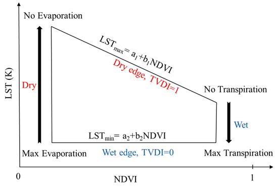 Trapezoidal space of land surface temperature (LST)/NDVI using Landsat 8 satellite images to calculate temperature vegetation dryness index (TVDI [0;1]). The wet edge (blue line) is the area where TVDI = 0 and the dry edge (red line) is the area with TVDI = 1.