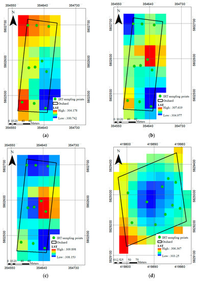 Tree water status and the determination of appropriate irrigation measure can be supported by digital plant data as suggested in the context of precision horticulture [1,2]. Established methods for estimating water stress such as gravimetrically or electrically measured soil and plant water contents are not only time consuming, but also produce discrete local data points, which may not be representative of an entire field or orchard. To maximize water use efficiency, new irrigation management strategies are needed [3,4,5,6]. Irrigation needs in the orchard are influenced by weather, climate variables, soil, and plant response, which can be measured with thermal imaging [3,7,8,9,10,11]. Furthermore, irrigation scheduling considering regulated deficit irrigation, is based on crop response to water stress at different growth stages [12,13,14,15]. Increased leaf temperature and decreased vegetation (leaf) water content (VWC) are signs of water stress monitored with thermal imaging [16] that can be implemented in the orchard by crane, tractor, and unmanned aerial vehicle (UAV). However, one of the key parameter in vegetation water balance studies is land surface temperature (LST). In the past, the LST was measured by infrared thermometers which was costly and time-consuming. Since the 1980s, the remote sensing (RS), particularly satellite imagery, methods have been used for LST calculations [17,18,19]. From the satellite position, “surface” means whatever is seen from the atmosphere on the surface of the earth, e.g., in an apple orchard, the tree canopy is considered as a surface, ergo the LST equals predominantly to the leaf surface temperature. An early effort for calculating LST using RS methods was made using the advanced very high resolution radiometer (AVHRR) on the NOAA 7 satellite, which acquires 1-km spatial resolution data, and applying the split window algorithm [20]. After analyzing the relevant sources of errors, the author showed that the split window method could be adopted with an accuracy of 3 °C. Among numerous applications of LST retrieval calculations, its application is still followed in estimating water status in the field [21]. In this regard, many studies have been carried out for developing and improving the LST retrieval methods [22,23,24,25,26] to estimate evapotranspiration. Moreover, the RS has been utilized for estimating vegetation indices (VI), such as the normalized difference vegetation index (NDVI) [27]. The scatter plot of these remotely sensed indices (NDVI and LST) resulted in a trapezoidal space, which has a physical concept i.e., the spatial relation (trapezoidal space) between LST and NDVI is applied to monitor the water status of crops and orchards using temperature vegetation dryness index (TVDI) [28,29]. However, the TVDI reflects a mixed signal of the soil moisture under trees and leaf water content of trees.