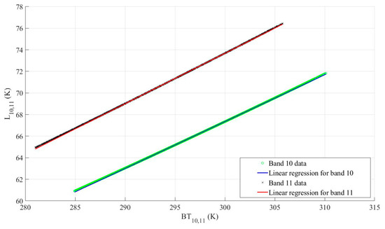 and in Equation (15) can be estimated by linear regression between and As Figure 6 and Table 7 show, the coefficients are between −64.37 and −61.74 for bands 10 and 11, respectively whereas, the coefficients are about 0.45 for both thermal bands. The data were perfectly fitted to the regression line (Figure 6) in all overpasses (R2 = 1).