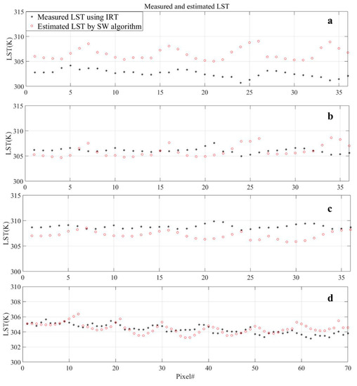 To validate SW Landsat 8 LST retrieval, IRT observations were applied. As Figure 8 and Table 8 show, the absolute mean error of the SW method was below 4 K in all overpasses to the extent that the maximum RMSE was found on 7 July with the value of 4.23 K and absolute mean error of 3.94 K. On the other hand, the RMSE value on the 17 August overpass in Altlandsberg was only 0.71 K with absolute mean error of 0.12 K.