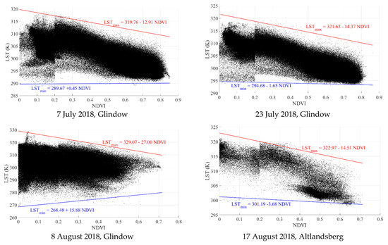 To calculate the dry and wet edges, the NDVI values were divided into 10 equidistant classes. For each class, the mean value of NDVI is considered as an independent variable of the linear regression, whereas the maximum and minimum values of LST for each class are considered as depended variable for dry and wet regression lines, respectively.