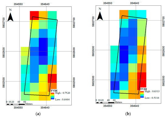 As indicated in the material and methods part, in the TVDI calculations, two visible bands (NIR and red) and TIRS bands of Landsat 8 are applied. In this regard, the dry and wet edges of LST/NDVI space were defined by using Equation (22), the spatial distribution of TVDI were generated (Figure 10). The mean values of TVDI on 7 and 23 July in Glindow are 0.69 and 0.57 which show the trees are under moderate water stress and the irrigation system should start to work soon but on 8 August—as expected—the trees are under severe water stress where the mean TVDI is 0.73; therefore, the irrigation system was not working at the appropriate time and needs to start irrigation immediately. On the other hand, the drip irrigation in the Altlandsberg orchard already started to work during the measurements as well the satellite overpass, and it can be seen the TVDI is less than 0.5 (averagely 0.34), so the tree water status is in normal condition without water stress.