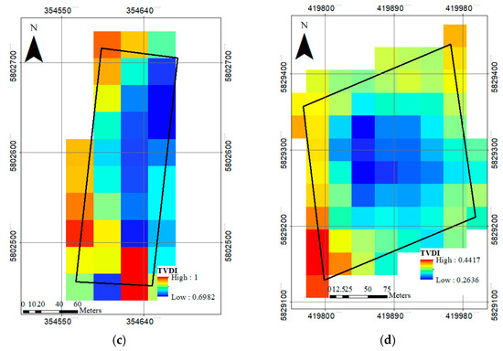 Temperature vegetation dryness index (TVDI [0;1]) spatial distribution for apple orchards. (a) 7 July 2018, Glindow; (b) 23 July 2018, Glindow; (c) 8 August 2018, Glindow; (d) 17 August 2018, Altlandsberg.