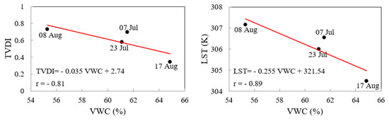 The results illustrated that, the LST and TVDI can be applied as indicators for vegetation water content (VWC), thus the correlation between latter parameters was investigated. In order to find the relation between VWC and TVDI (and/or LST), and more importantly to validate the satellite based index, a linear regression model was developed between two parameters. As Figure 11 shows, the empirical relationship between values of measured VWC and TVDI/LST has a relatively high negative correlation coefficient. Relationships between VWC and temperature-based indices for different trees at different locations would enable irrigation planners to estimate VWC.