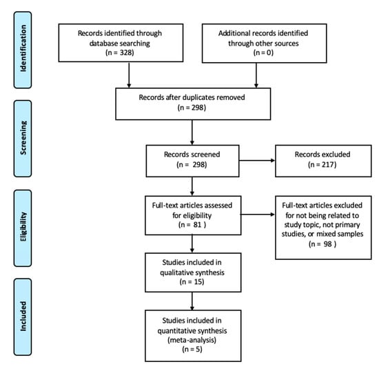 The search was conducted in September 2019. Figure 1 shows the studies that were reviewed in each phase. A total of 328 documents were located after the search. Then, after reviewing the title and abstract, 217 documents were excluded because they did not meet the inclusion criteria. Finally, after evaluating 81 full texts, the sample was composed of 15 studies for the systematic review and 5 for the meta-analysis.
