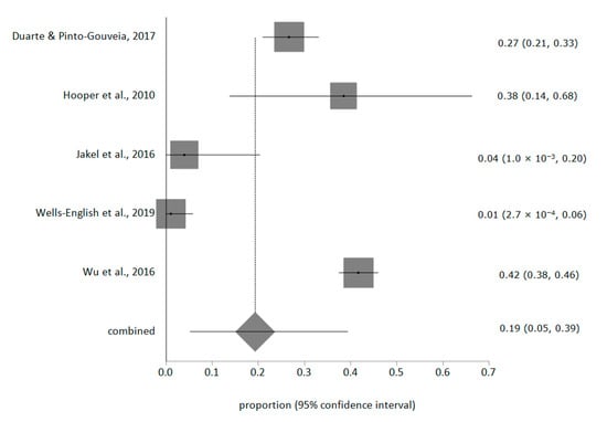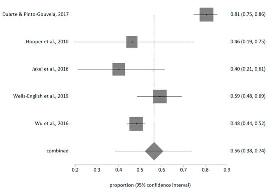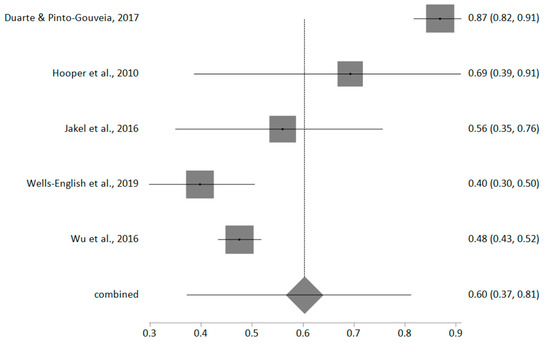 The meta-analytic estimation with a 95% confidence interval for low compassion satisfaction, as shown in Figure 2, was 19% (5–39%). Figure 3 shows medium and high levels of burnout, with a prevalence rate of 56% (38–74%). The medium and high compassion fatigue prevalence rates were 60% (37–81%), as shown in Figure 4.