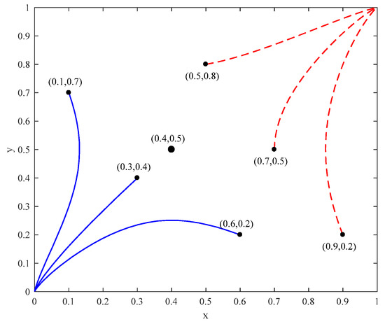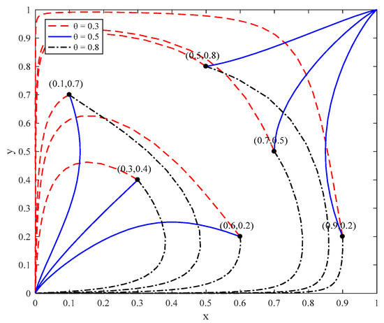 Through variables setting, the saddle point of is worked out as . Randomly set 6 initial states of enterprises’ knowledge sharing behavior as , , , , , and , and then observe the dynamic evolution process of network system over time in Figure 2.