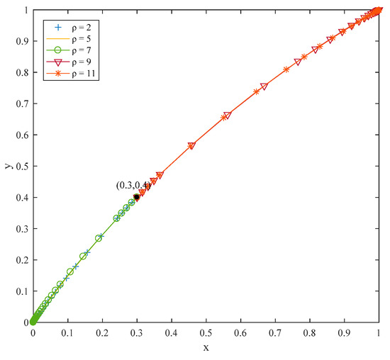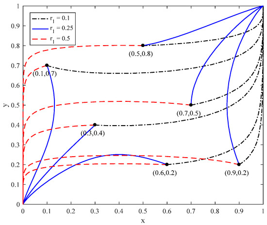 As can be seen from Figure 12, the direct revenue coefficient does not affect the dynamic evolution in cluster innovation network. The direct revenue coefficient is the embodiment of one enterprise’s ability to absorb knowledge shared by the other, which is closely related to the enterprise’s own knowledge stock, autonomous learning ability, etc. In Figure 12, the curves of different overlap, that is, the values of do not affect the evolutionary trajectory of the network, because the is not reflected in the saddle point of the network. Therefore, although the direct revenue of enterprise knowledge sharing behavior is conducive to improving the enthusiasm of knowledge sharing, it has little impact on either the process or final results of the overall network dynamic evolution.