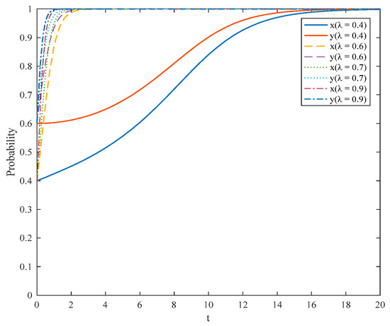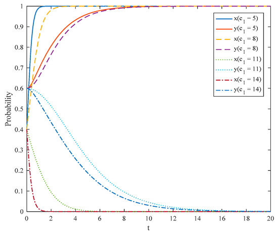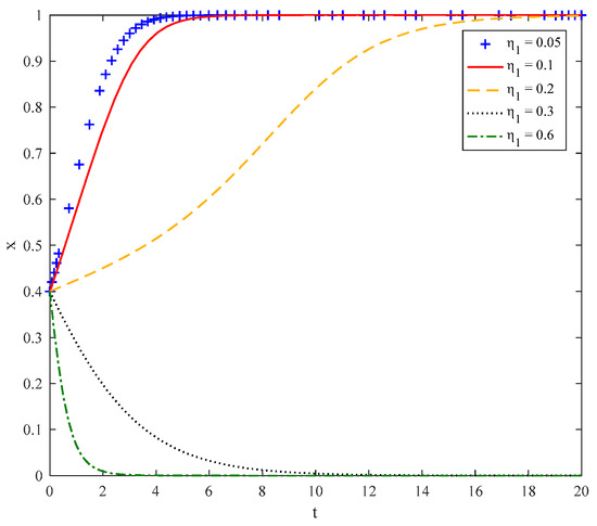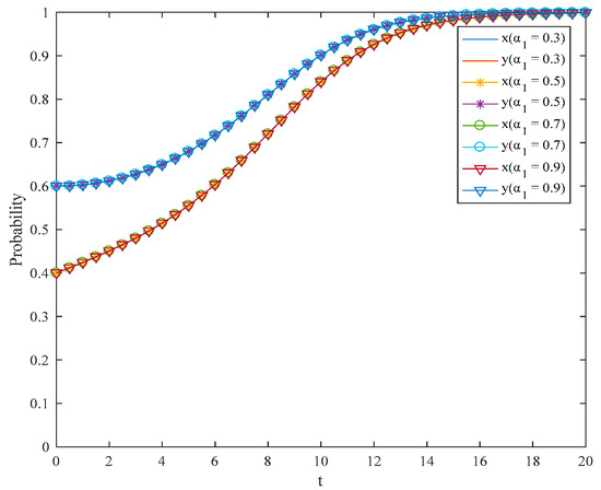As can be seen from Figure 10, the incentive coefficient is positively correlated with the network evolutionary equilibrium. With the increase of , the network is more likely to converge to and the convergence speed is increasingly faster. The incentive coefficient refers to the third party’s encouragement for enterprises adopting knowledge sharing strategy proactively.