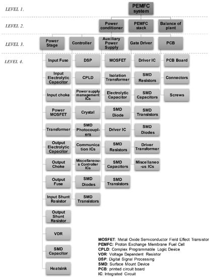 Four levels of PEMFC system along with all the main components and sub-components in the power conditioner.