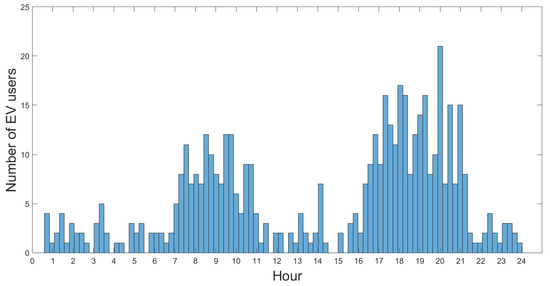 Random numbers will be created according to these schedules to create starting charging time profiles. For each vehicle, a starting hour is assigned, where i ∈. Figure 2 shows the histogram corresponding to 500 EV users’ starting time in a day.