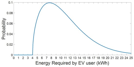 The charging needs may vary from 4 kWh to 28 kWh, but with more values between 6 and 10 kWh, that can be normal values of energy required [36]. This curve allows to have different values of energy required by user, that differs importantly. It was also mentioned that models as BYD e6 have a battery capacity of 60 kWh, but the case of users that have this EVs and charge more than 28 kWh are ignored. Note that these parameters are chosen with the behavioral conditions of Quito individuals, but this curve could differ significantly in other areas. So, the values for the parameters selected are: a = 7.5; b = 1.5; c = 4. Density probability curve is obtained in Figure 3. Note that the integral of this curve is equal to 1.