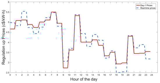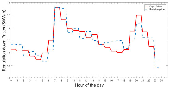The EV user has to pay the variable electricity price and a constant value that corresponds to the benefits of the EV aggregator, which corresponds to its revenues for the service provided. The EV user has a discount corresponding to the participation in regulation services, which corresponds to the last term and comes from the cost of the EV aggregator from Equation (19). Note that the price is calculated for each time horizon , which is different for all users.