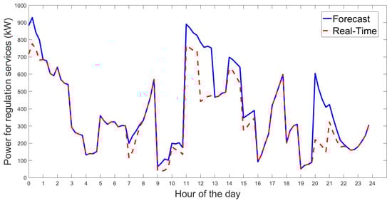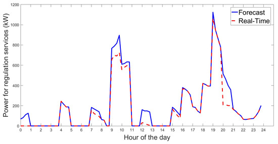 In particular, Equation (5) indicates that if the EV aggregator fails to comply with the given regulation bid in the real-time, a penalty will be imposed at the end of the current day. A penalty cost was assumed considering a penalty coefficient for the energy that was not consumed or delivered. Equation (6) indicates that the EV aggregator has to discount an amount for the battery degradation that is considered for the V2G mode when the EV supply energy to the grid. This penalty cost was not considered for the G2V mode since it is minimal compared to V2G. The parameter is a factor that defines the battery degradation per kWh absorbed from the EV battery. Equation (7) corresponds to the cost for the investment of bidirectional chargers, such as indicated in [28]. Since the cost was assumed in this work for 390 $ for the installation of a bidirectional charger, it is considered that the EV aggregator has to pay a cost per day and per EV charging, so the factor for the bidirectional charger was assumed to be = 0.2 $ per day and per charging station. Note that only green and blue CCP users are considered for these costs, they’re the only one that bidirectional chargers can use. Equation (8) indicates that a part of the revenues from the EV aggregator has to be distributed to the EV users. In this way, EV users could be interested for participating in ancillary services. It is assumed = 5%.