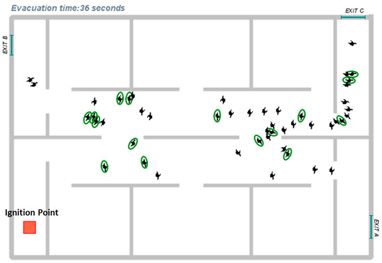 On the basis of data analysis of the evacuation abilities of each vulnerable group, the study conducted evacuation simulations using a computational model previously developed and tested by the authors [42], thereby comparing evacuation performance results in terms of response and movement under different conditions. The simulation model was built using AnyLogic 7 software, which was developed by AnyLogic Company. The software provides a pedestrian library, which uses a social force model that allows individuals to move according to the pre-assigned rules in the given environment [43]. An example of a screenshot during the simulation is presented in Figure 1.