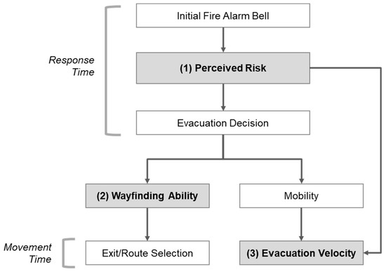 In a building fire, the actions of its occupants are not based on random chance shaped by a shifting environment but are instead the result of individual behavioral or decision-making processes [10,11]. Prior research on this topic indicates that the progression of behavior involved in the response to an emergency situation includes stages such as (1) perception of certain cues, (2) interpretation of the situation and its consequent risks based on perceived cues, (3) decision-making in terms of subsequent action according to the interpretation of the situation, and (4) performance of the finalized action [11,12,13,14,15,16]. More specifically, the phases that precede formulating an evacuation decision (e.g., information seeking, response) are also known as the risk perception process, as they are closely associated with the extent of the risk that the occupants of a particular facility perceive on the basis of observing the situation around them [17,18]. Because of the processes involved in building fire evacuations, physical or cognitive disabilities among the occupants would not only have an effect on their ability to respond to and evacuate from an emergency situation but would also exhibit a much more significant impact than they might under non-threatening circumstances [19].