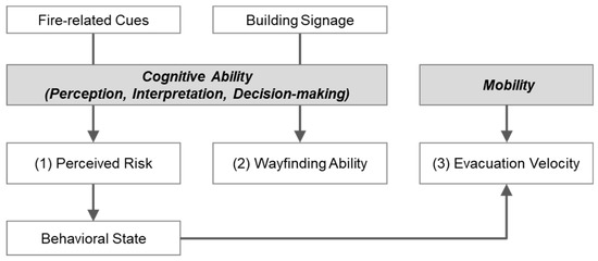 As previously stated, the critical elements that affect an individual agent’s evacuation behavior and performance include (1) perceived risk, (2) wayfinding ability, and (3) evacuation velocity. Figure 3 illustrates how each element is affected by the agent’s cognitive abilities and mobility within the model.