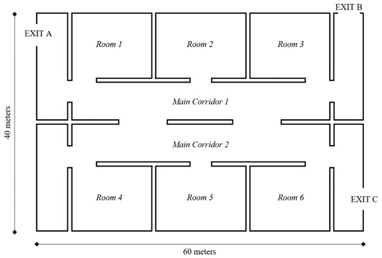 Simulations were conducted in an artificial environment (shown in Figure 4) which consisted of a single floor health care facility with six rooms, two main corridors, and three exits across a total area of 2400 m2.