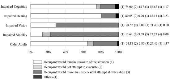 Figure 5 illustrates the major causes for evacuation failure in a healthcare facility housing occupants with different disabilities. The survey respondents described groups of older adults (64.38%), groups with impaired hearing (80.64%), and groups with impaired cognition (75.00%) as those most likely to experience evacuation failure during a building fire because these occupants would remain unaware of the emergency situation. Several respondents indicated that older adults (6.8%), the mobility impaired (9.09%), and the cognitively impaired (4.16%) would not or could not attempt to evacuate the premises due to mobility- or cognition-related disabilities. Most of the responses concerning people with impaired vision (77.27%) and mobility impairment (71.42%) predicted that these vulnerable occupants would attempt to evacuate but likely fail to complete a successful evacuation due to difficulties in finding available egress paths through which to vacate the building before conditions inside became unsustainable. According to the results of the survey, each vulnerable group experiences different factors that would have a significant effect on the outcome of their evacuation from a building fire.