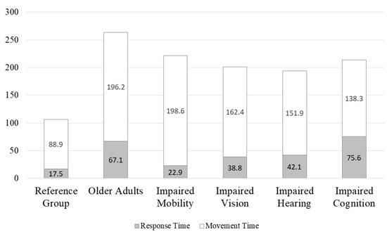 Figure 7 illustrates the evacuation performance and mean response/movement times of the five vulnerable groups and the reference group. Within 17.5 seconds, all building occupants in the reference group became aware of the emergency after the fire alarm sounded (t = 0); within 88.9 seconds, the evacuees had egressed the building. Of the five vulnerable groups, the group that required the longest time to complete the evacuation process consisted of elderly citizens (263.3 seconds on average). It took M = 67.1 seconds for all agents to finalize their evacuation decisions and M = 196.2 seconds for them to clear the building. In terms of response time, the group of cognitively impaired occupants needed the longest time (M = 75.6 seconds) to make evacuation decisions, but their movement time was the shortest among all the vulnerable groups at an average of 138.3 s. The group with impaired mobility recorded the shortest response time (22.9 s) and the longest movement time (198.6 s). Between the vision and hearing impaired groups, agents with hearing impairment took slightly longer to finalize their evacuation decisions upon recognizing the emergency situation (M = 42.1 s) compared to the group with impaired vision (M = 38.8 s). This was likely due to the initial fire cues being given in the form of an alarm, which could not be easily perceived by the deaf and hard of hearing. However, during the movement phase, the group of visually impaired occupants spent a longer period of time clearing the exits (M = 162.4 s) compared to the group with hearing impairment (M = 151.9 s), as the visual limitations of the former group made it difficult to identify available escape routes during evacuation.