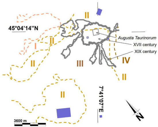 The historical development of the city of Turin, Italy, which presently occupies ~130 km2 hosting some 908,000 citizens. The continuous grey lines indicate the perimeters of the town when it was: (i) Augusta Taurinorum (conventionally 28 AD), inhabited by less than 5000 citizens (the grey square, W of the Roman quadrilateral is the probable necropolis); (ii) the capital of the Duchy of Savoy (seventeenth (XVII) century) with about 40,000 inhabitants; and (iii) the capital of the Kingdom of Sardinia (nineteenth (XIX) century) with about 90,000 inhabitants. The current main cemeteries are the quadrilaterals filled in violet. Brown Roman numbers indicate the classes of Land Capability Classification, which depend on soil limitations to various uses: class I does not have any limitation to crops, class II and III show moderate to severe limitations that require special conservation practices, and class IV requires careful soil management due to severe limitations (source: Regione Piemonte, www.regione.piemonte.it/agri/suoli_terreni/suoli1_50/carta_suoli/gedeone.do).
